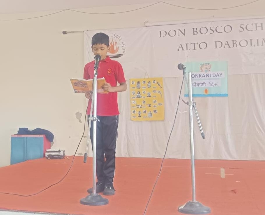 Representing Grade 3, Nikhil Dunna, trained by Teacher Yashwant, delivered a speech highlighting the importance of the Konkani language. Similarly, Sreeraj Prabhu from Grade 4 presented a short and meaningful speech on the same theme.